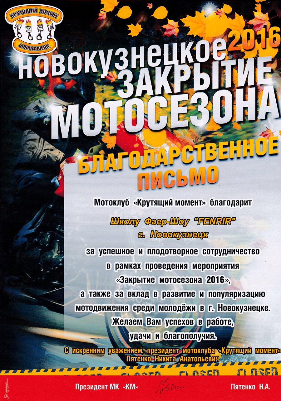 Огромное спасибо Шоу-Проекту FENRIR за отличное Фаер шоу на городском открытии мотосезона! Вы, настоящие профессионалы и умеете подарить массу впечатлений и хорошего настроения зрителям . С нетерпением ждём следующих новых выступлений))